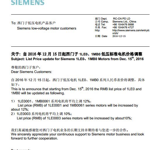西門子調(diào)價通知