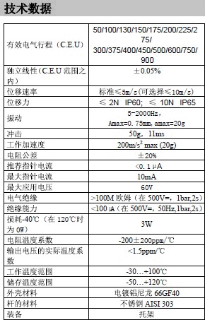 GEFRAN杰弗倫LT拉桿式位移傳感器又稱電子尺、電阻尺等。GEFRAN LT拉桿式直線位移傳感器,采用內(nèi)部碳膜電阻涂層,配合電刷滑動實現(xiàn)電阻變化,從而轉(zhuǎn)換為位移量。GEFRAN LT直線位移傳感器采用拉桿式設(shè)計,配合萬向節(jié)安裝。LT拉桿式位移傳感器獨立線性度為±0.5%FS,量程從50~900mm可選。位移速度小于5m/s、殼體材料使用不銹鋼材質(zhì)、最大供電電壓可達60VDC、電阻公差±20%。
