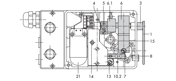 電氣氣動定位器用于分配閥門位置(控制變量)和控制信號(參考變量)。它是一個控制和調(diào)節(jié)裝置即將到來的啟動信號控制閥的行程與氣動相比較控制驅(qū)動壓力(輸出)。定位器由電動氣動裝置組成轉(zhuǎn)換器單元(21)和帶杠桿(1),軸的氣動部件(1.1)和彈簧和控制系統(tǒng)帶噴嘴,擋板和放大器。那個控制裝置即將到來的控制信號(輸入信號),來自的直流信號。 B. 4至20mA,應(yīng)用于電動氣動變壓器單元(i / p轉(zhuǎn)換器)在比例壓力信號中引導(dǎo)并存在pe形成。隨著改變的電流信號變化也與氣動成正比控制系統(tǒng)提供氣壓pe??諝鈮毫e依次產(chǎn)生測量膜片(8)的力量比較彈簧(6)的力。測量膜片(8)的運(yùn)動傳遞在手寫筆(9.1)上擋板(10.2)和噴嘴(10.1)是驅(qū)動。氣壓變化pe或閥門位置引起壓力下游噴嘴的變化放大器(12)并有控制設(shè)定壓力pst會導(dǎo)致塞桿與參考變量對應(yīng)的位置占據(jù)。