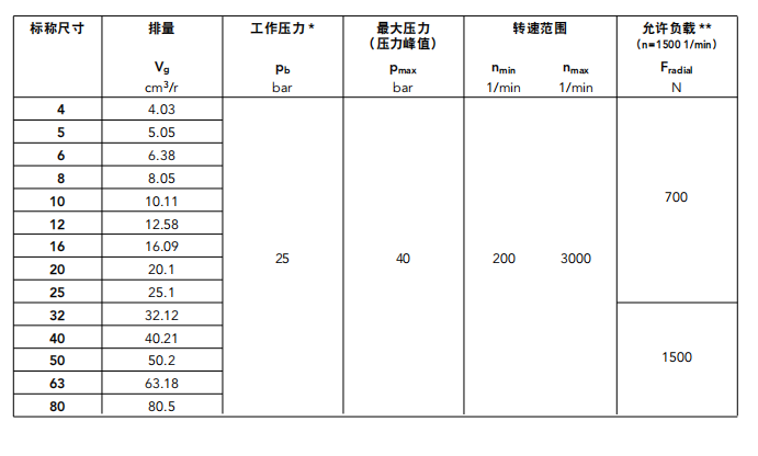 另外針對于流量/排量及工作壓力以下數(shù)據(jù)表為參考: