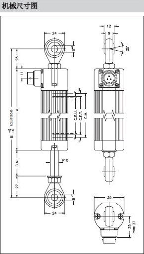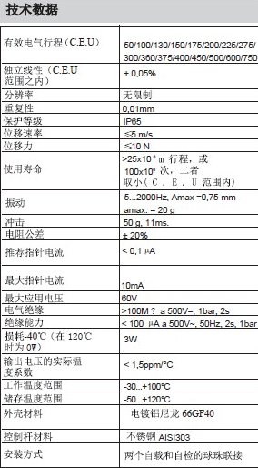 GEFRAN PC拉桿式直線位移傳感器又稱電子尺、電阻尺等。GEFRAN PC拉桿式直線位移傳感器,兩端采用余眼軸承設(shè)計。拉桿直徑為10mm、量程50~750mm、獨立線性度±0.5%、防護等級IP65、位于速度>5m/S、最大供電電壓60vdc、重復(fù)性0.01mm、本質(zhì)無線分辨率。環(huán)境溫度-30~100°C、殼體材料使用不銹鋼材質(zhì)、、電阻公差±20%、。GEFRAN PC直線位移傳感器內(nèi)部碳膜電阻涂層,配合電刷滑動實現(xiàn)電阻變化,從而轉(zhuǎn)換為位移量。
