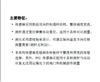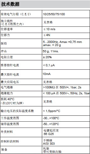 GEFRAN PY2頂珠式直線位移傳感器又稱電子尺、電阻尺等。GEFRAN PY2直線位移傳感器,電器可選電纜線以及街頭等連接方式。自帶回彈式設(shè)計,頂部采用頂珠式方式。量程50~100mm、獨立線性度±0.5%、防護等級IP65、位移速度>5m/S、最大供電電壓60vdc、重復(fù)性0.01mm、本質(zhì)無線分辨率。GEFRAN PY2直線位移傳感器使用環(huán)境溫度-30~100°C、殼體材料使用不銹鋼材質(zhì)、電阻公差±20%。GEFRAN PY2直線位移傳感器內(nèi)部碳膜電阻涂層,配合電刷滑動實現(xiàn)電阻變化,從而轉(zhuǎn)換為位移量。