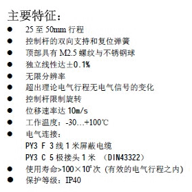 GEFRAN PY3滾珠式直線位移傳感器又稱電子尺、電阻尺等。GEFRAN PY3直線位移傳感器,電器可選電纜線以及街頭等連接方式。采自帶回彈式設計,頂部采用滾珠方式。量程50~100mm、獨立線性度±0.5%、防護等級IP65、位移速度>5m/S、最大供電電壓60vdc、重復性0.01mm、本質無線分辨率。GEFRAN PY3直線位移傳感器使用環(huán)境溫度-30~100°C、殼體材料使用不銹鋼材質、電阻公差±20%。GEFRAN PY3直線位移傳感器內部碳膜電阻涂層,配合電刷滑動實現(xiàn)電阻變化,從而轉換為位移量。