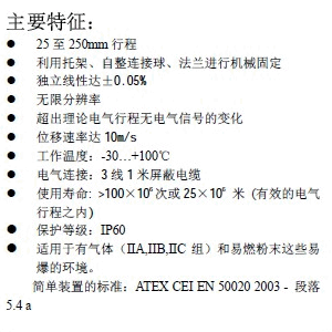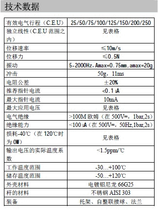 GEFRAN PZ12直線位移傳感器又稱電子尺、電阻尺等。GEFRAN PZ12直線位移傳感器提供了三種不同的尺寸及安裝方式,適合于大部分油缸位移的檢測。測量量程從50~250mm、獨立線性度±0.5%、防護等級IP65、位移速度>5m/S、最大供電電壓60vdc、重復性0.01mm、本質(zhì)無線分辨率。GEFRAN PZ12直線位移傳感器使用環(huán)境溫度-30~100°C、殼體材料使用不銹鋼材質(zhì)、電阻公差±20%。GEFRAN PY3直線位移傳感器內(nèi)部碳膜電阻涂層,配合電刷滑動實現(xiàn)電阻變化,從而轉(zhuǎn)換為位移量。