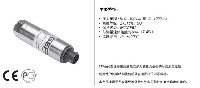 GEFRAN-TPS壓力傳感器。意大利GEFRAN TPS壓力傳感器又稱(chēng)壓力變送器、壓力探頭、壓力感應(yīng)器等。GEFRAN TPS壓力傳感器精度±0.15%、傳感器壓力量程0~1000bar、本質(zhì)無(wú)限分辨率、傳感器供電電壓最大30VDC、2倍滿(mǎn)量程超壓。
